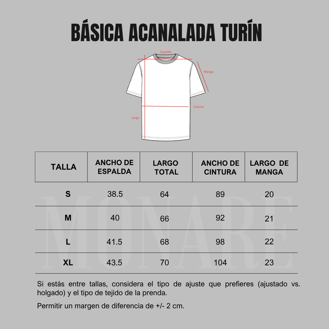 Camiseta Básica Acanalada Turín, en corte Slim Fit, confeccionada en tejido de punto acanalado que se adapta al cuerpo con suavidad y confort. La camiseta cuenta con puños, cuello y cintura en Rib, resistente a la deformación y muy suave al tacto