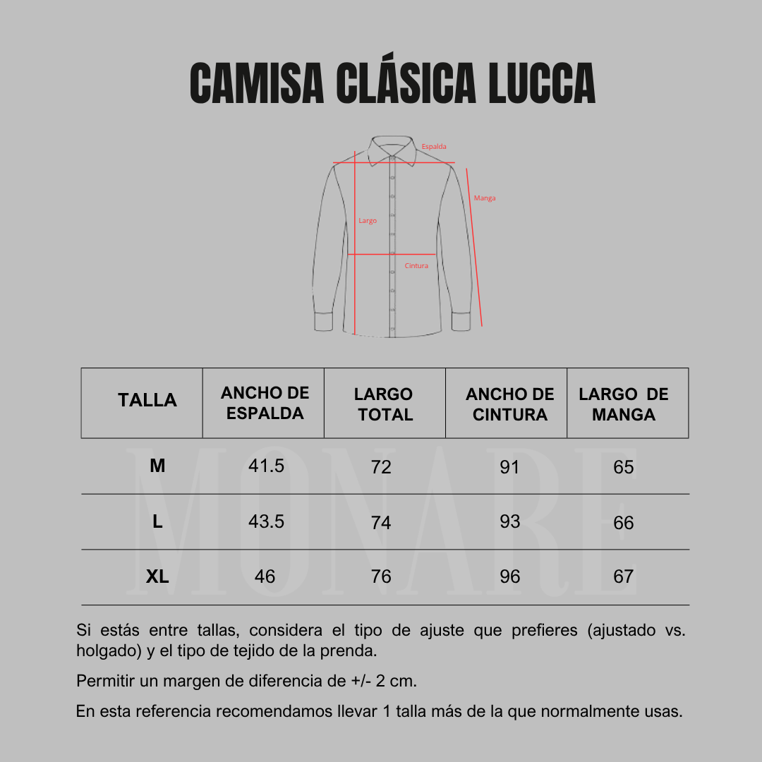 Camisa clásica Lucca manga larga, confeccionada en 100% algodón de alta calidad. Con un corte Slim Fit, esta prenda rinde homenaje a la elegancia atemporal, adaptada al estilo del hombre moderno.