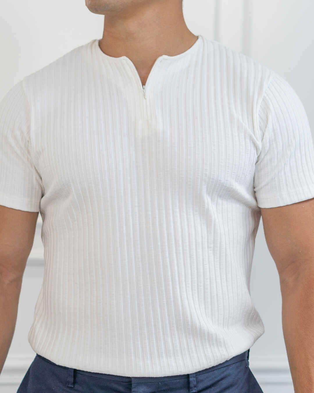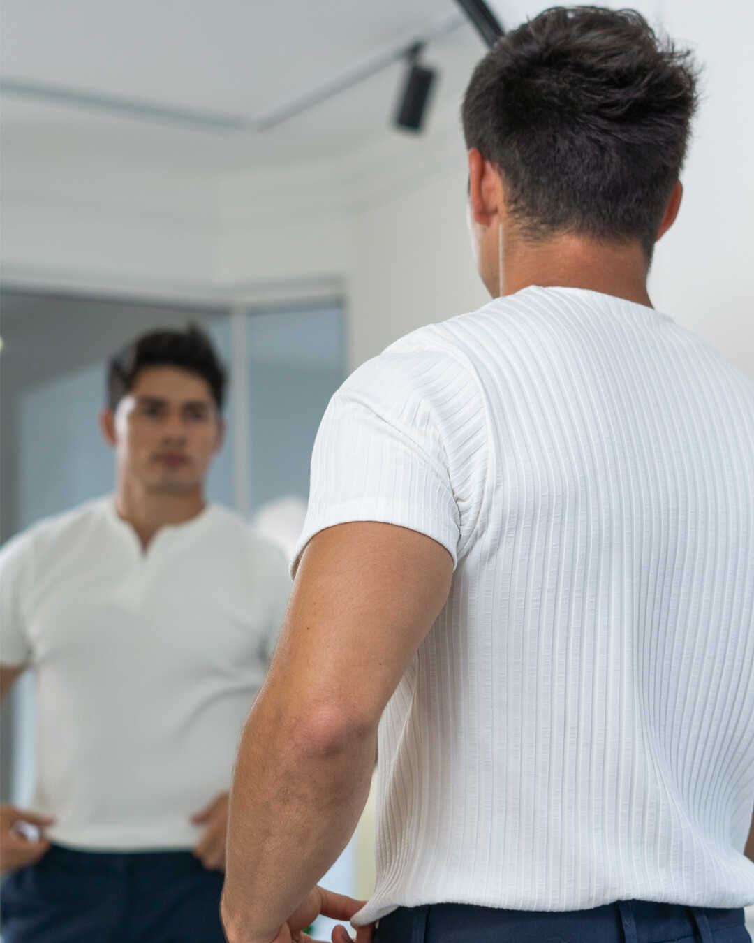 Camiseta Palermo en horma Slim fit, confeccionada en tejido de punto tipo Rib. Tiene cierre invisible en el cuello para mayor versatilidad y un acabado moderno. Prenda ligera, cómoda y con ajuste al cuerpo.